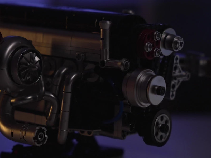 This set includes bricks and instructions to build the complete functional engine with its red valve cover, chrome details, rotating internals and electric-powered movement.